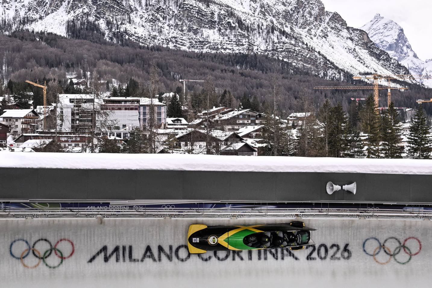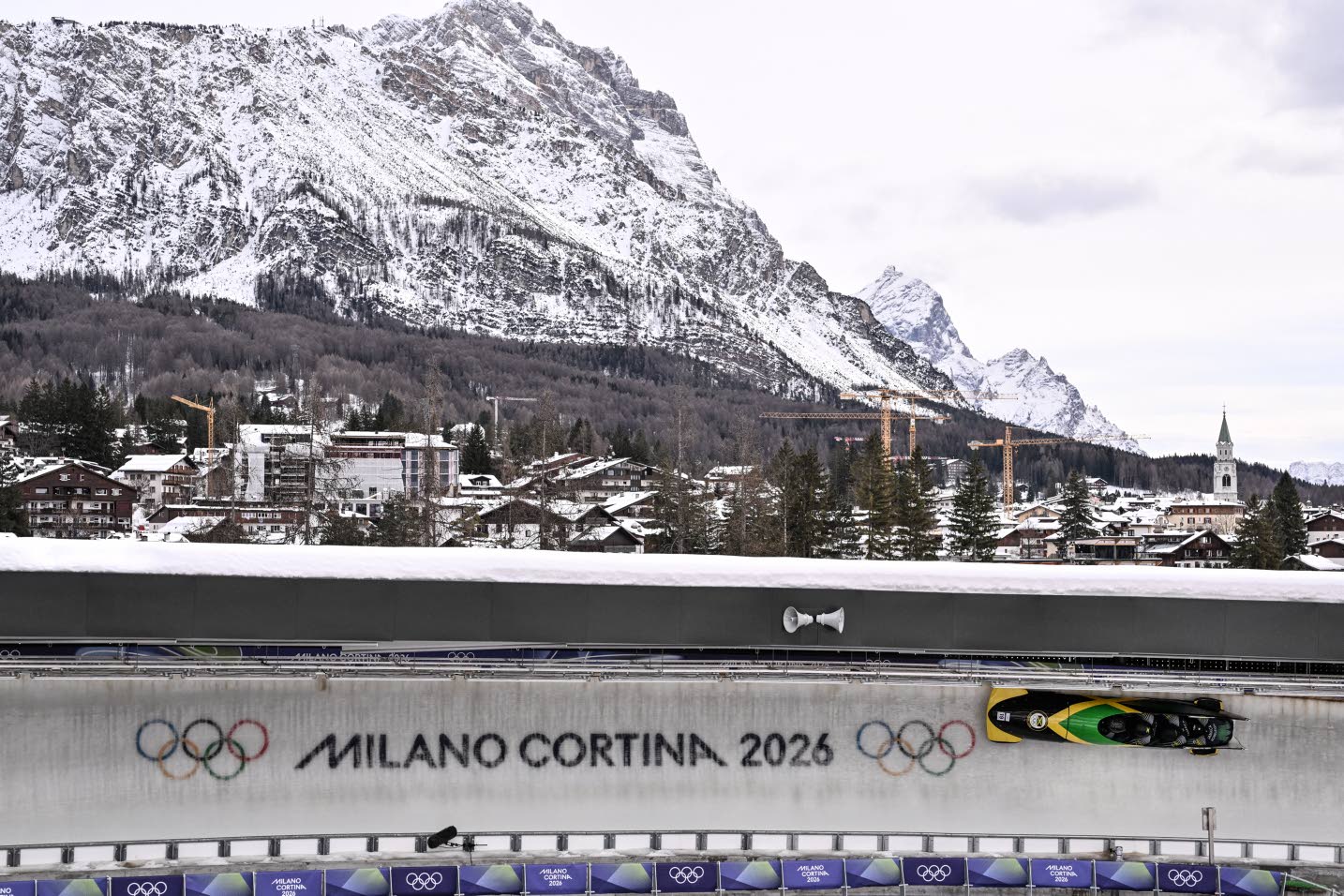 Jamaica’s Shane Pitter pilots the bobsleigh men’s four-man training session heat 3 at Cortina Sliding Centre during the Milano Cortina Winter Olympic Games in Cortina d’Ampezzo, Italy, on Thursday. AFP