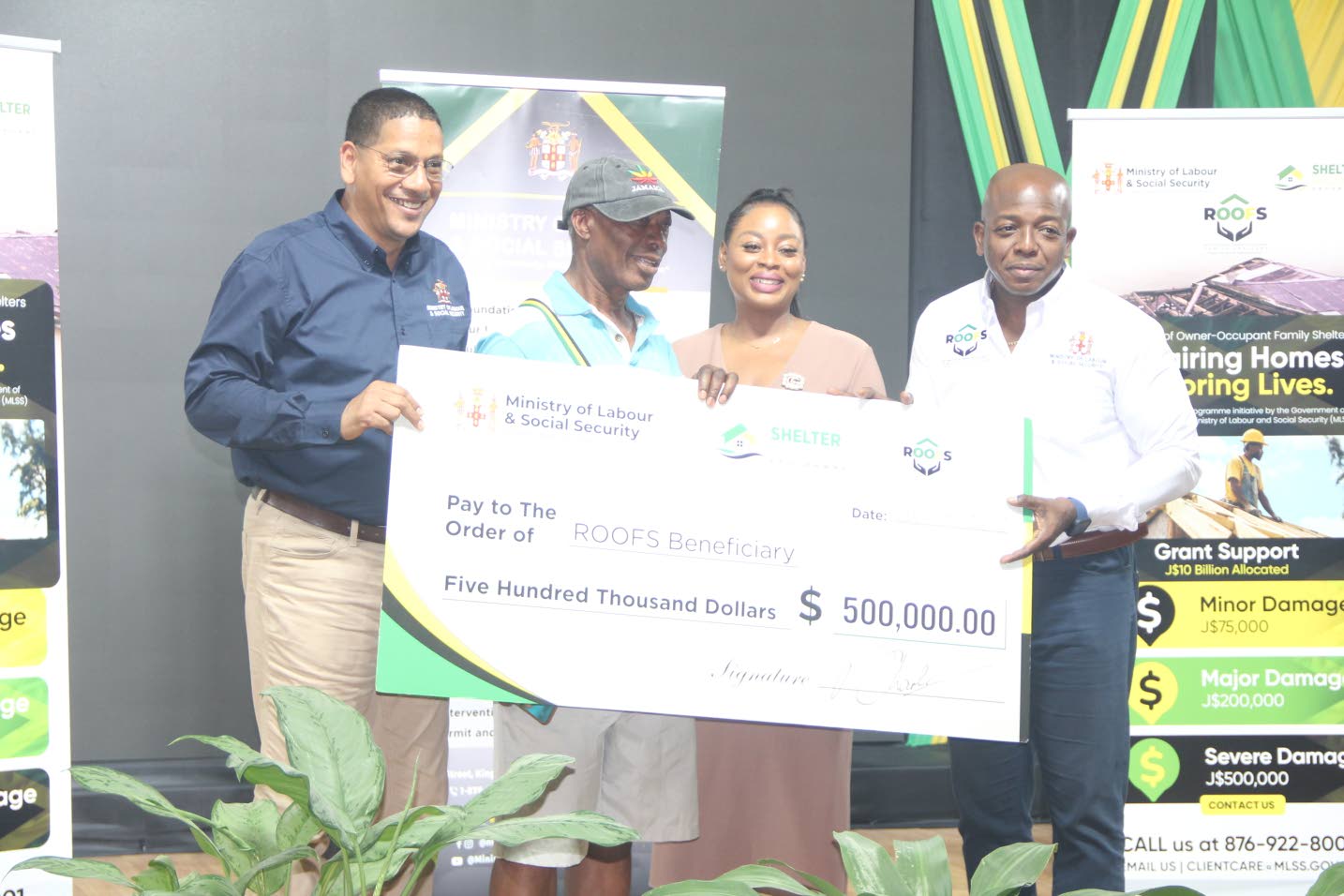 Juliet Howard (second left) collects her ROOFS cheque from Labour Minister Pearnel Charles Jr (right) on Thursday while minister of state in the Social Security Ministry Donovan Williams and Member of Parliament for St James West Central Marlene Malahoo-Forte look on.