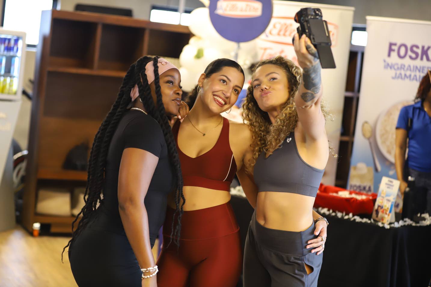 Sweat, Smile… Selfie! Musical artiste Jaz Elise (left) snapped a quick ussie with singer/actress Sevana (centre) and Express Fitnesss Marketing Coordinator Geahnnie Watt..