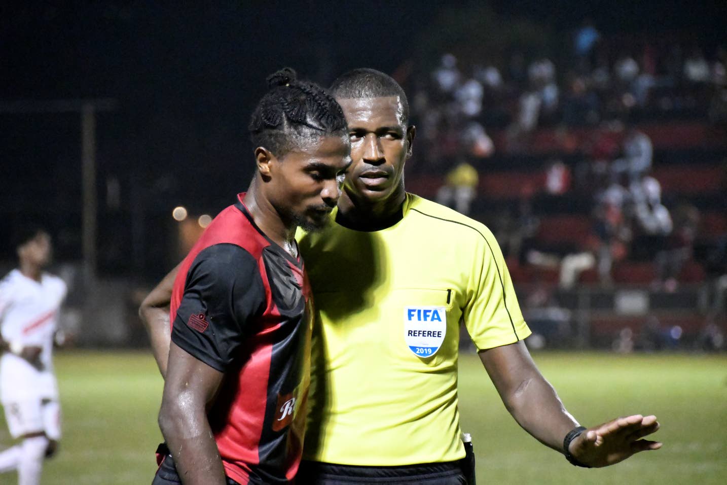 Referee Daneon Parchment (right), one of the most recognised officials in Jamaica, gives Arnett Gardens’ Patrick Brown a warning after the player committed an infringement against University of the West Indies FC in their Red Stripe Premier Legaue game at Anthony Spaulding Sports Complex in this 2019 file photo. (Photo: Naphtali Junior)