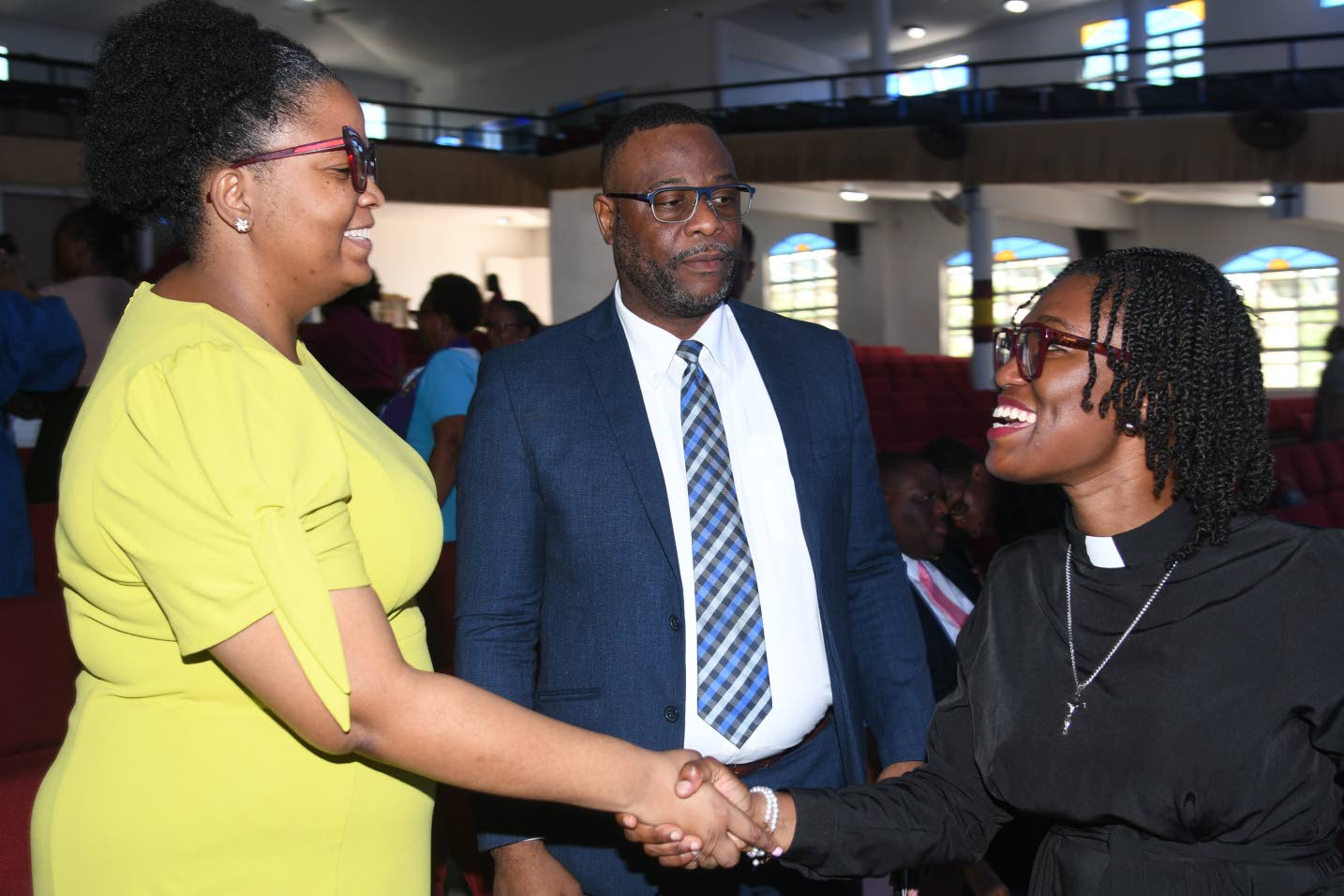 Reverend Tashi Campbell (right) assistant pastor of Portmore Holiness Christian Church in St Catherine, greets Kimberley Hibbert, first vice-president of the Press Association of Jamaica (PAJ); and Dashan Hendricks, president of the PAJ, at the church on Sunday during a service to mark the start of the 2025 National Journalism Week. The week is being celebrated from March 1 to 7, a rescheduled time frame following postponement last November due to the impact of Hurricane Melissa. (Photos: Karl Mclarty)