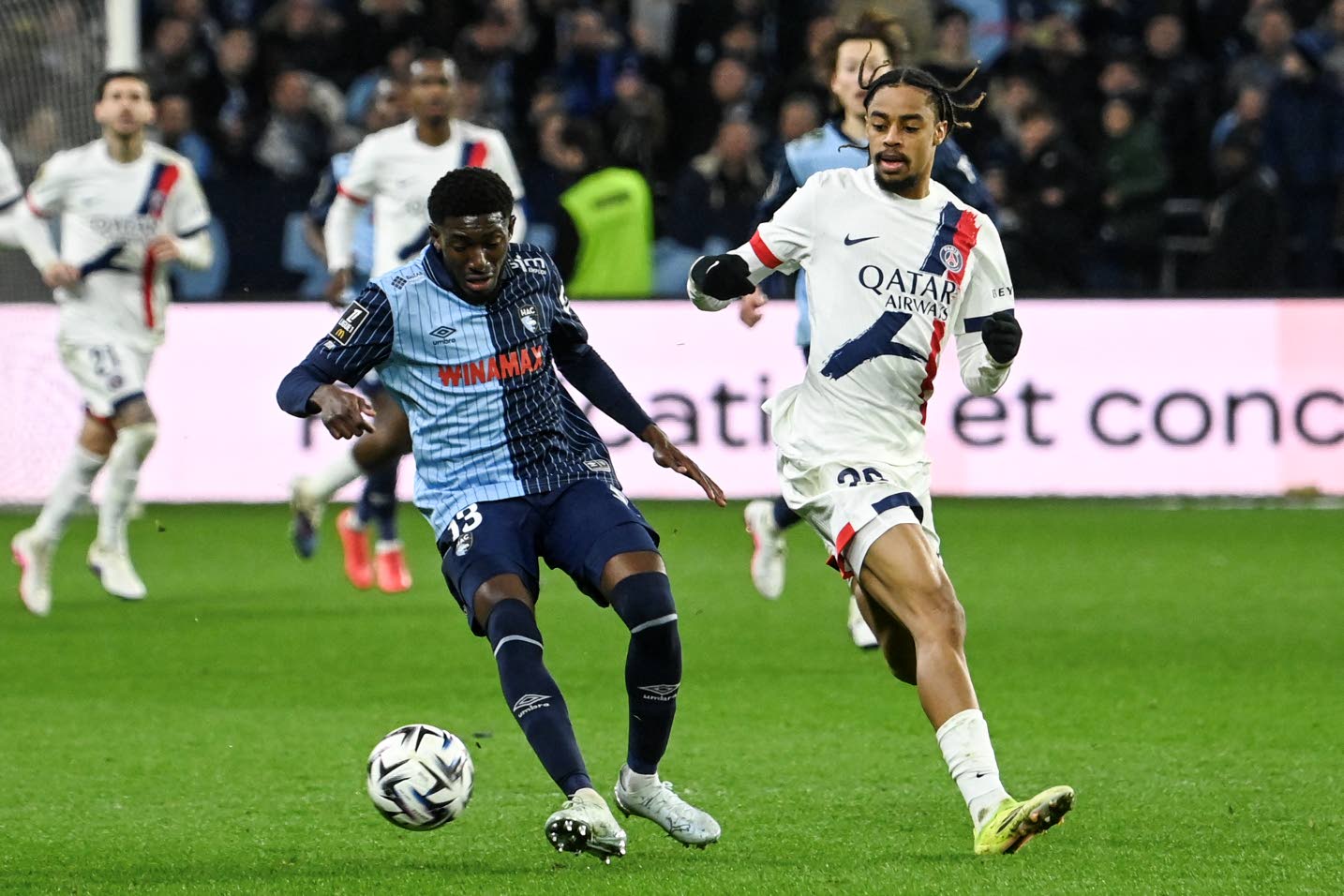 Le Havre’s Malian defender Fode Doucoure (left) fights for the ball with Paris Saint-Germain’s French forward Bradley Barcola (R) during the French L1 football match between Le Havre AC and Paris Saint-Germain (PSG) at the Stade Oceane in Le Havre, north-western France, on February 28, 2026. (Photo: AFP)