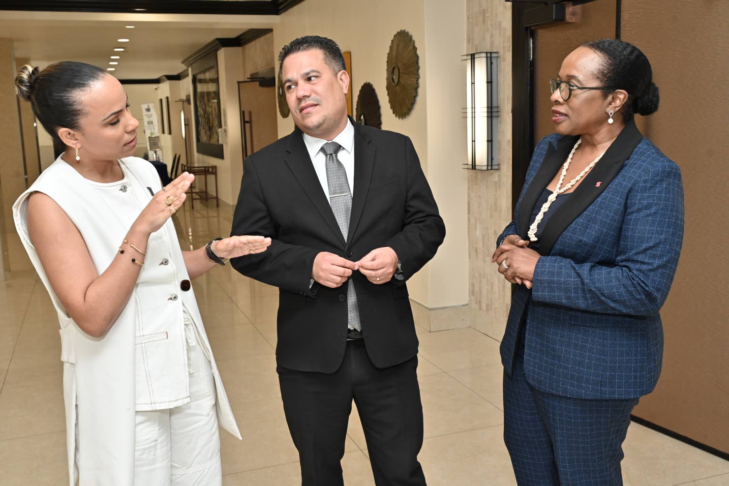 President of the Realtors Association of Jamaica (RAJ), Gabrielle Gilpin-Hudson (left) makes a point to Minister of Water, Environment, and Climate Change Matthew Samuda and Head of Retail Banking, Caribbean North and Central, Scotiabank, Yvett Anderson. The occasion was RAJ’s Leaders in Real Estate Breakfast, held at the Jamaica Pegasus hotel in New Kingston on February 26.
