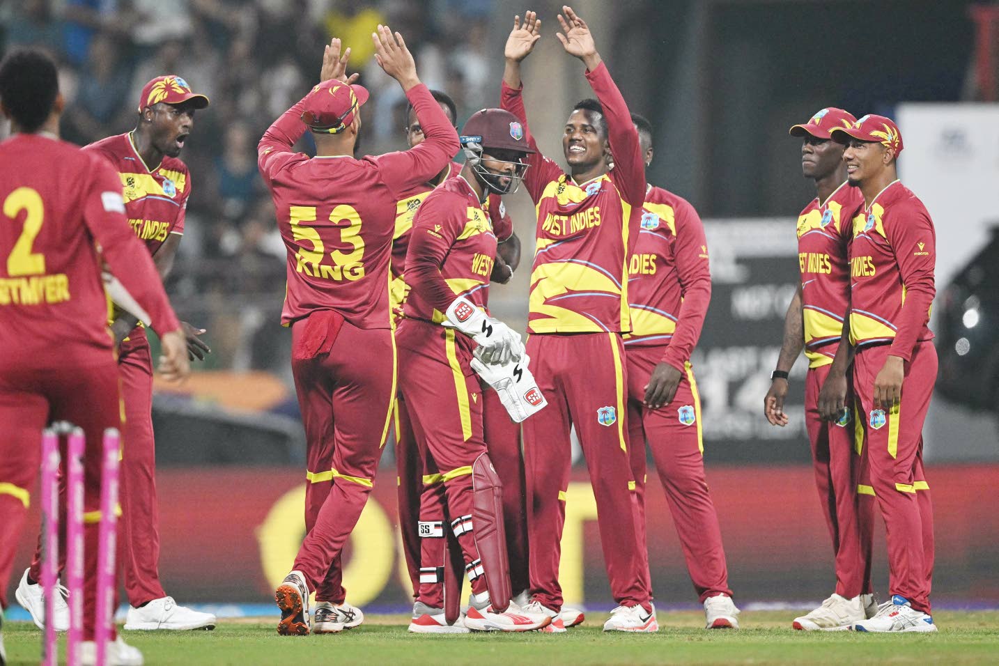 MUMBAI, India — West Indies bowler Akeal Hosein (centre) celebrates with teammates after taking the wicket of Zimbabwe’s Brian Bennett during the 2026 ICC Men’s T20 Cricket World Cup Super Eights match at the Wankhede Stadium in Mumbai on February 23, 2026. West Indies lost their decider game to India on Sunday resulting in their exit from the tournament. (Photo: AFP)