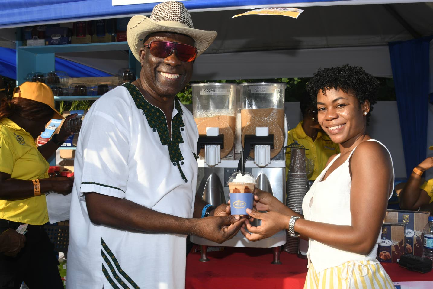 Journalist Kelesha Williams received a cup of iced coffee from Mavis Bank Coffee Factory Managing Director and CEO Dr Norman Grant.(Photo: Karl Mclarty)