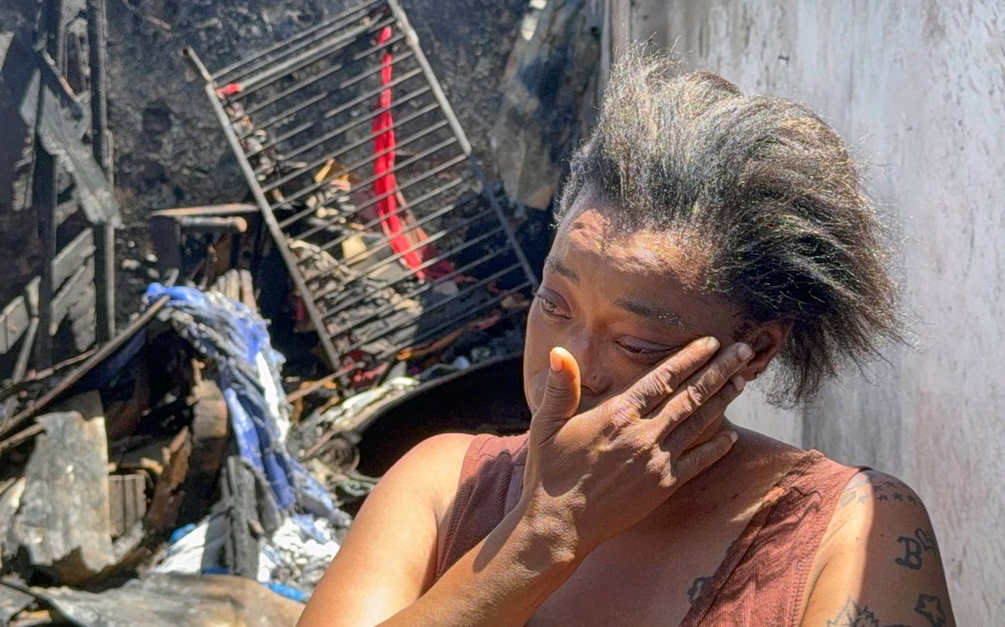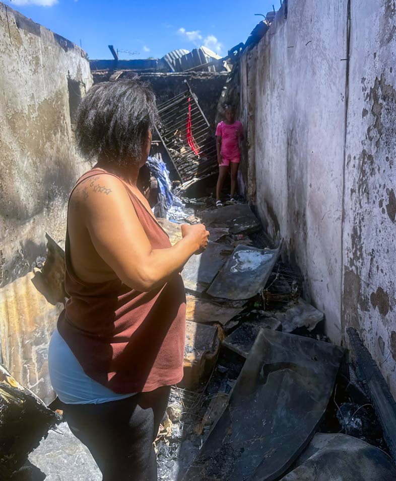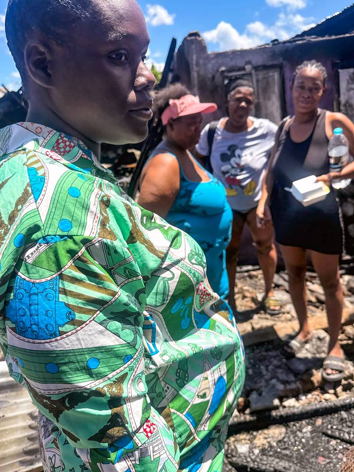 “I called out to my daughter and my next sister. My three-bedroom house was right here. Everything gone, including birth certificate, money, and my things that I sell at Calabar Infant, Primary and Junior High School gate at 2A Sutton Street. My daughter didn’t save anything. She is supposed to go to work in two weeks’ time. One week ago she buried her baby. My pregnant sister had her two-bedroom and she didn’t save anything. Everything gone up in flames. I really need the help so my kids can go back to school and I can put out back my stall and try to build back something. On Saturday I bought four shoes for them and everything burn up — uniform, bag, books, everything,” said Tomlinson.