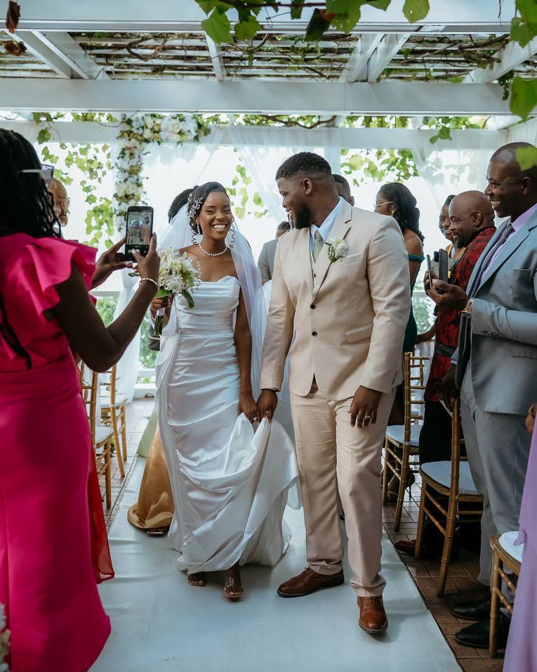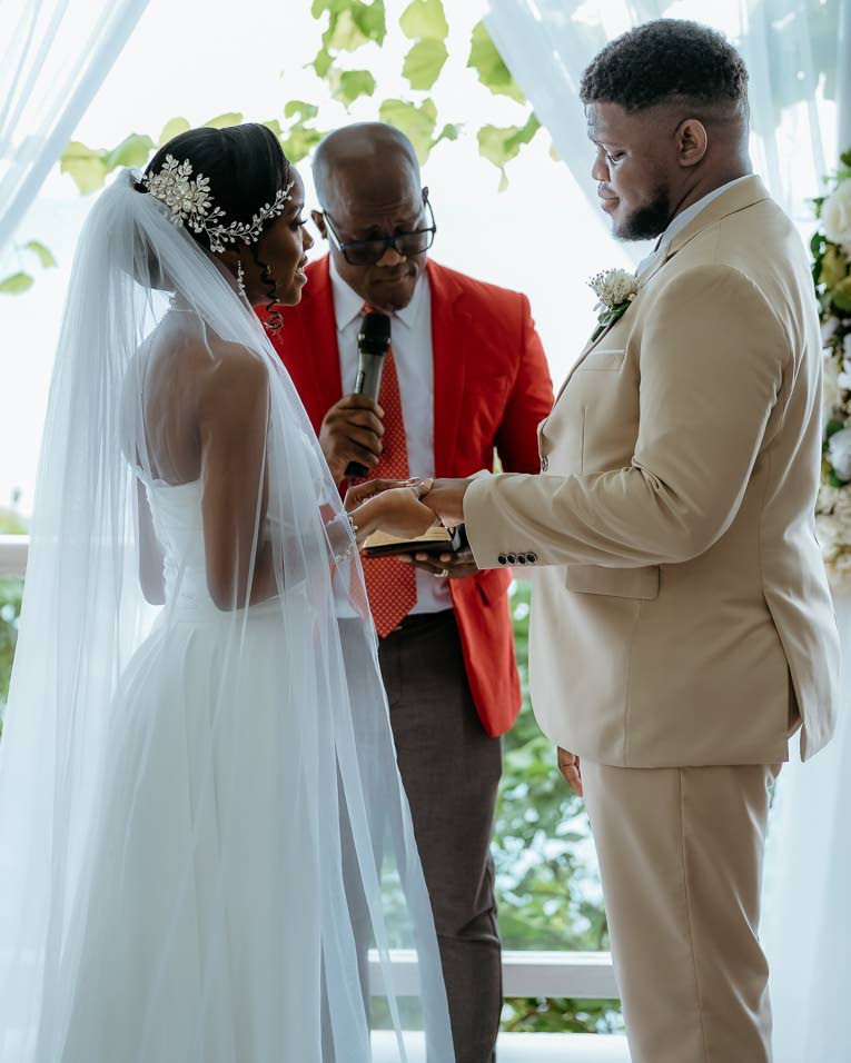 The Hibiscus Lodge Hotel became a breathtaking sanctuary for the day, beautifully styled by Plus One Wedding Services. All eyes were on Ishana as she appeared in an elegant satin sheath gown from Bliss Bridal JA. To the sounds of You and Me by Johnny Gill, she was escorted by Pastor Hubert Welsh towards her anxious bridegroom. In an intimate ceremony led by Pastor Dennis Davis, the couple pledged their love witnessed by close friends and family.