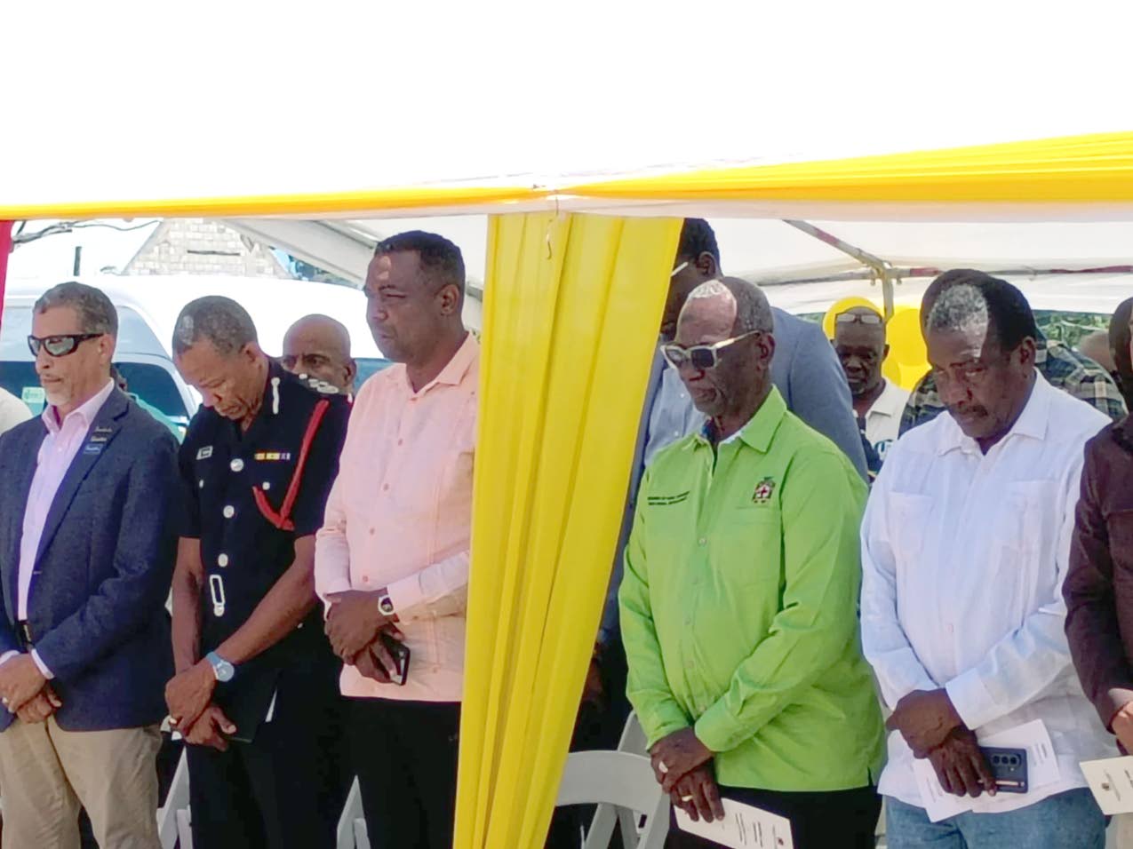 In a moment of prayer during the donation of two buses which will be retrofitted as emergency response vehicles were Jeremy Jones, regional managing director, Jamaica for Sandals Resorts International; Stewart Beckford, commissioner of Jamaica Fire Brigade; mayor of Port Maria, Fitzroy Wilson; Desmond McKenzie, minister of local government and community development; and Robert Montague, Member of Parliament for St Mary, Western. (Photo: Ingrid Henry)