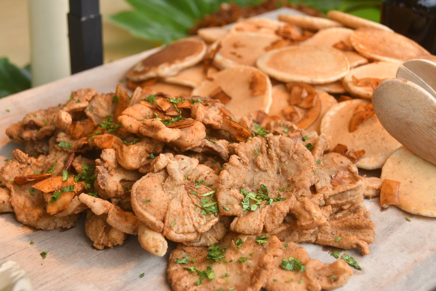 Deep fried oyster mushrooms and lemon pancakes with herbed cashew ricotta, crispy smoked coconut and hot honey. (Photo: Garfield Robinson)