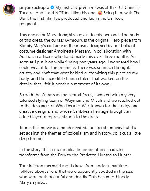 Promote a movie, but make it fashion! Lead actress Priyanka Chopra Jonas wore the original hero piece from Bloody Mary’s costume in The Bluff designed by costume designer Antoinette Messam to the world premiere of Amazon Prime Video’s The Bluff. The look was styled by Wayman + Michah, and included a custom brown skirt from Who Decides War, and Bulgari jewellery.