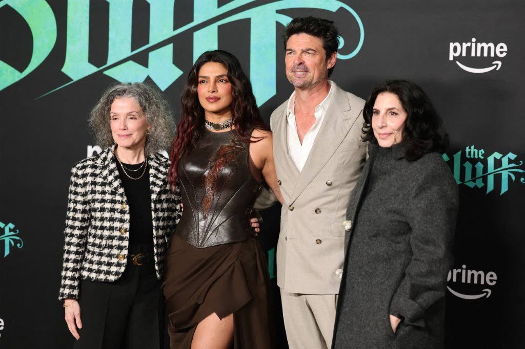 Amazon MGM Studios Head of Film, Streaming, and Theatrical Courtenay Valenti (left) and Head of Global Marketing Sue Kroll (right) stand alongside The Bluff stars Priyanka Chopra Jonas and Karl Urban at the movie’s world premiere at TCL Chinese Theatre on February 17, 2026 in Hollywood, California. (Photo: AFP)