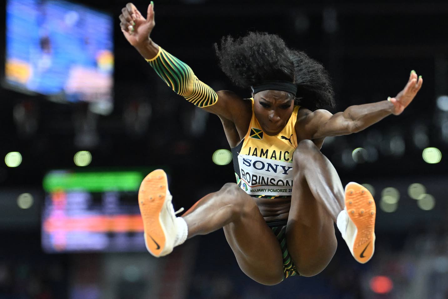 Jamaica’s Nia Robinson competes in the women’s long jump final during the World Athletics Indoor Championships.