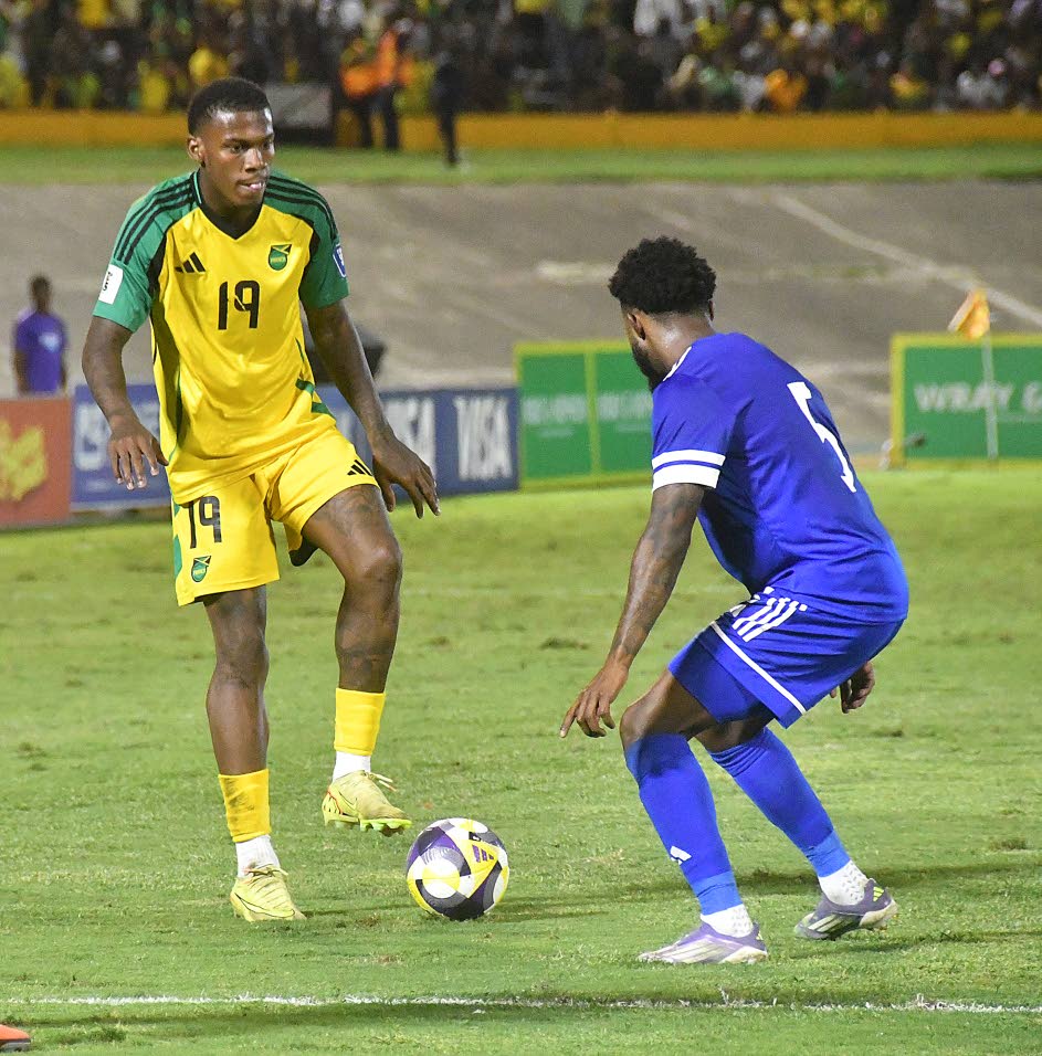 Jamaican goalscorer Renaldo Cephas (left) celebrates with teammate Shamar Nicholson after giving his team the lead in the 1-1 draw with Trinidad and Tobago during the Concacaf World Cup qualifier at Hasely Crawford Stadium on November 13, 2025. Photo: Garfield Robinson