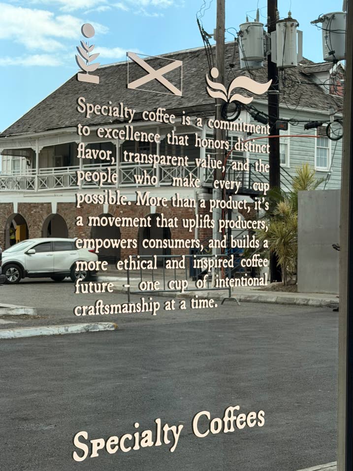Inscription on the window explains exactly what “speciality coffee” is. (Photo: Christopher Reckord)