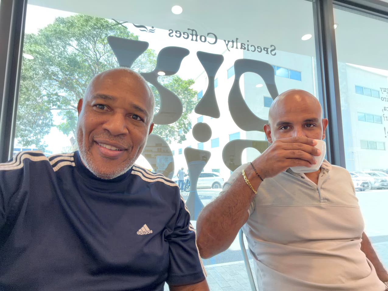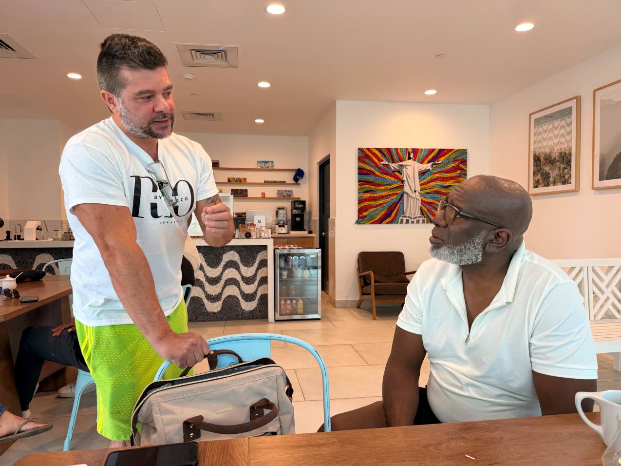 Jamaica Observer Table Talk Food Awards judge Christopher Reckord (left) introduced Infiniti Partnerships Inc founder Kirk-Anthony Hamilton to the new coffee house (Photo: Christopher Reckord)