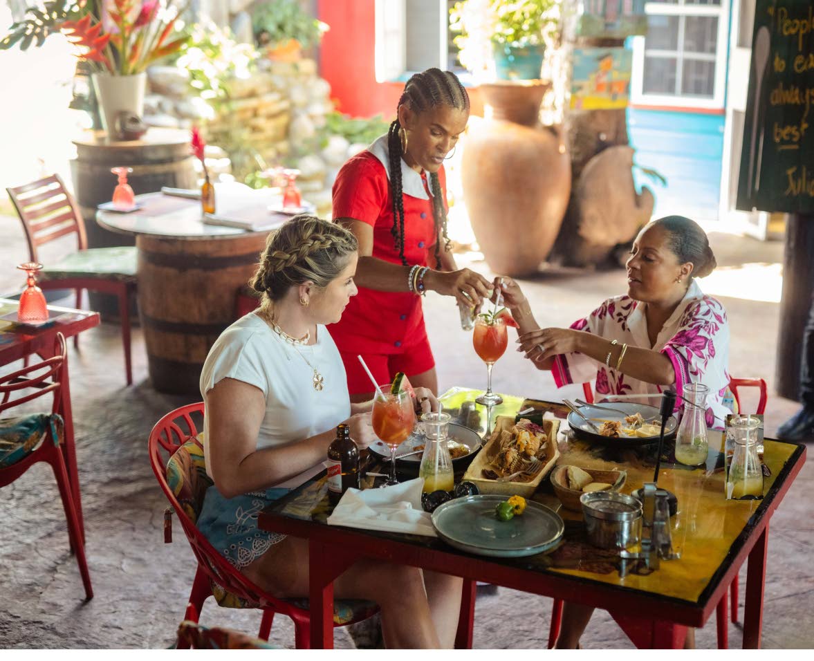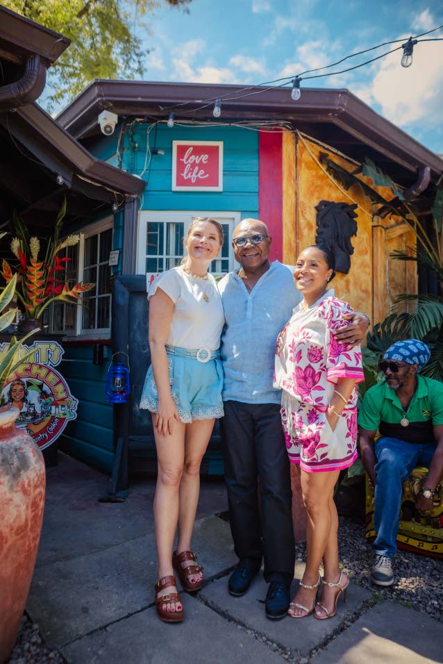 Delivering a taste of Jamaica, Miss T’s Kitchen principal Anna-Kay Tomlinson (centre) served jerk chicken, curried goat and escoveitch fish to NBC’s TODAY Show hosts Jenna Bush Hager (left) and Sheinelle Jones at her restaurant in Ocho Rios.
