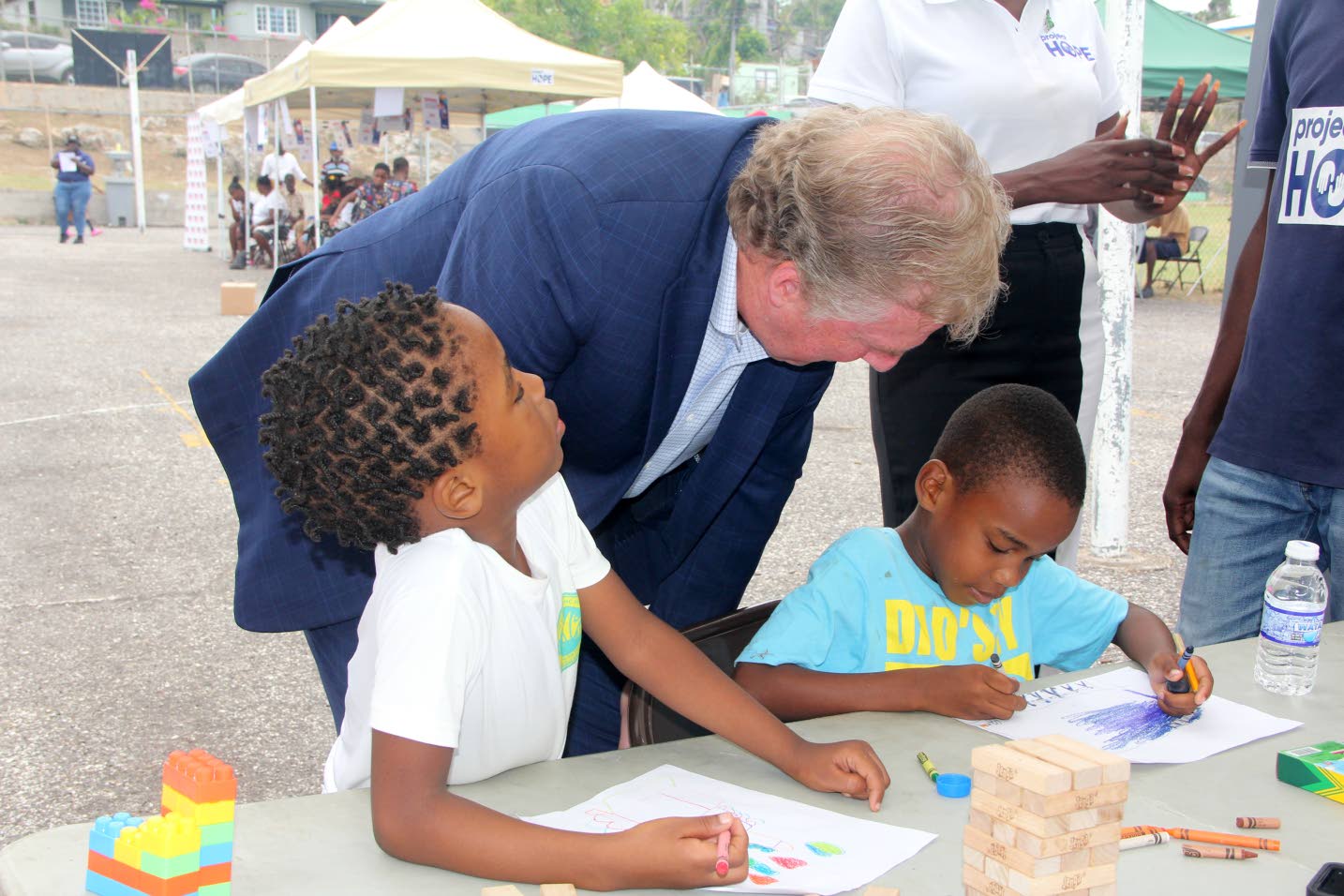 Chargé d’Affaires at the US Embassy in Jamaica, Scott Renner, interacts with King McFarlane and Joshua Brown during his visit to Project Hope’s Mobeil Medical Unit in Barrett Town on Friday.