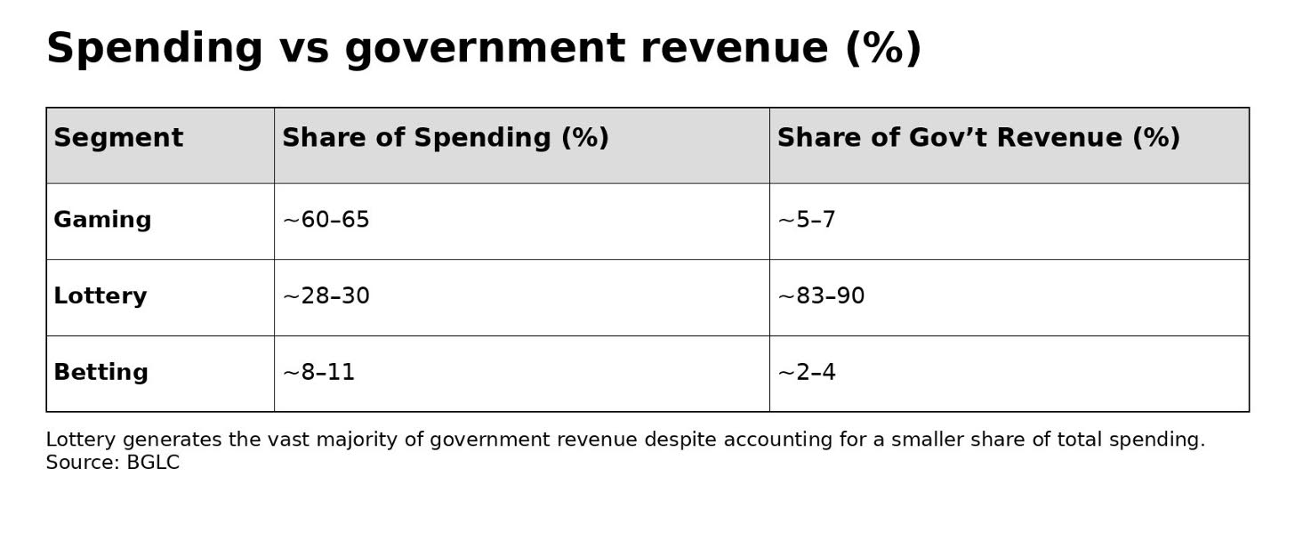 Spending is increasingly concentrated in gaming, betting is gradually expanding, and lottery’s role — while still central to government revenue — is steadily losing ground within the broader market.