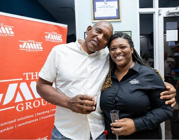 Colleen Ebanks, branch operations manager, JMMB Santa Cruz, embraces David Henry, businessman & farmer, during the recently held JMMB Group client mixer.