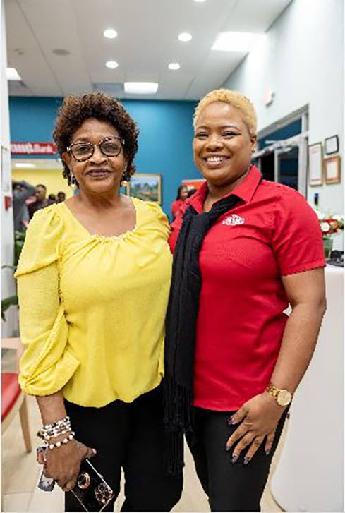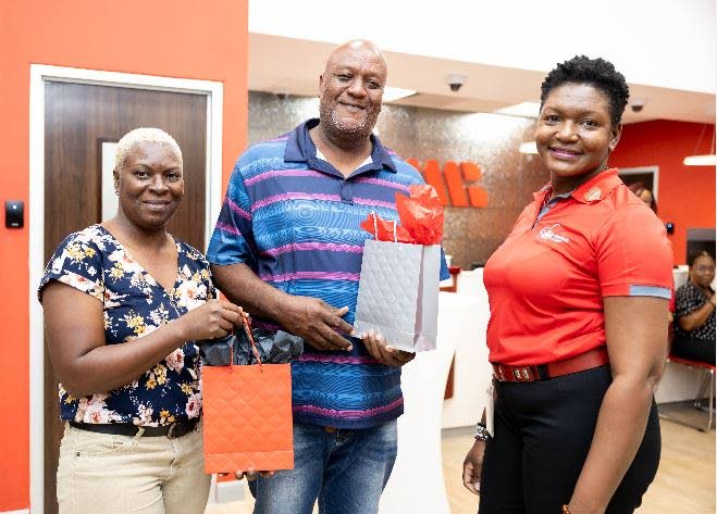 Natalee Parkes-Larmond (right), life goals manager at JMMB Mandeville, presents tokens to Mr Howard Gammon and his wife, long-standing clients at JMMB.