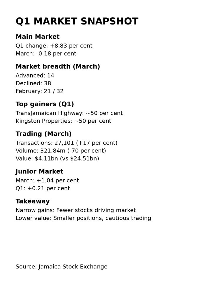 The Main Market index rose 8.83 per cent for the three months to March 31, reflecting gains built up earlier in the period. However, it slipped 0.18 per cent in March, trimming some of those gains and suggesting the rally lost steam toward the end of the quarter.
