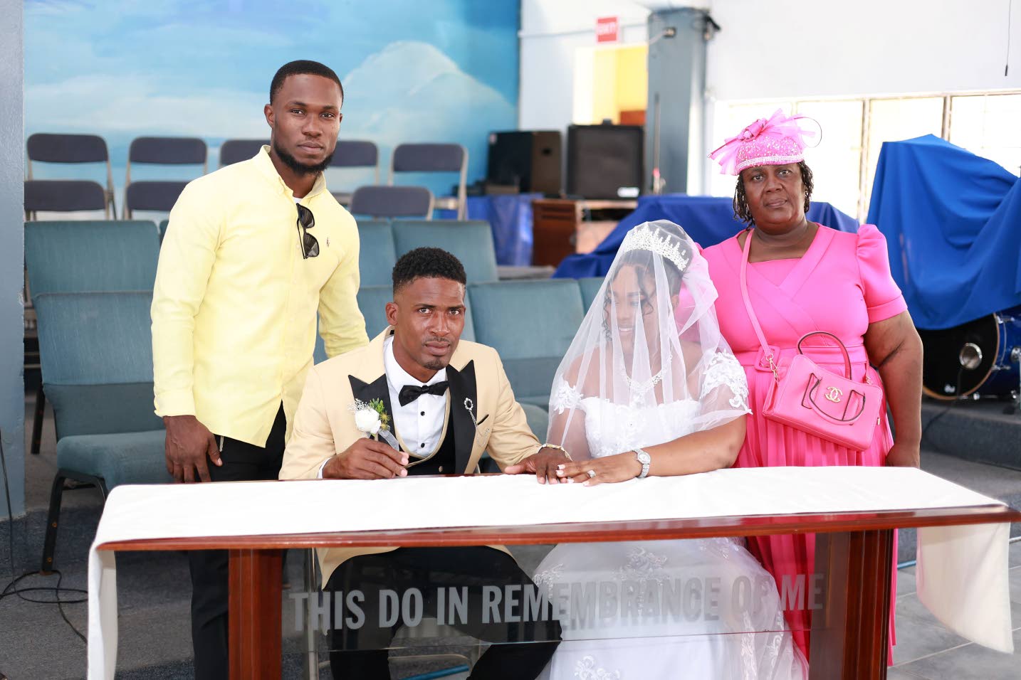 Before signing the marriage registry, Geoncarlo (second right) and Adriana share a moment during the ceremony with best man Joshua Smikle and maid of honour Dione Baker. (Photo: RT_Media)