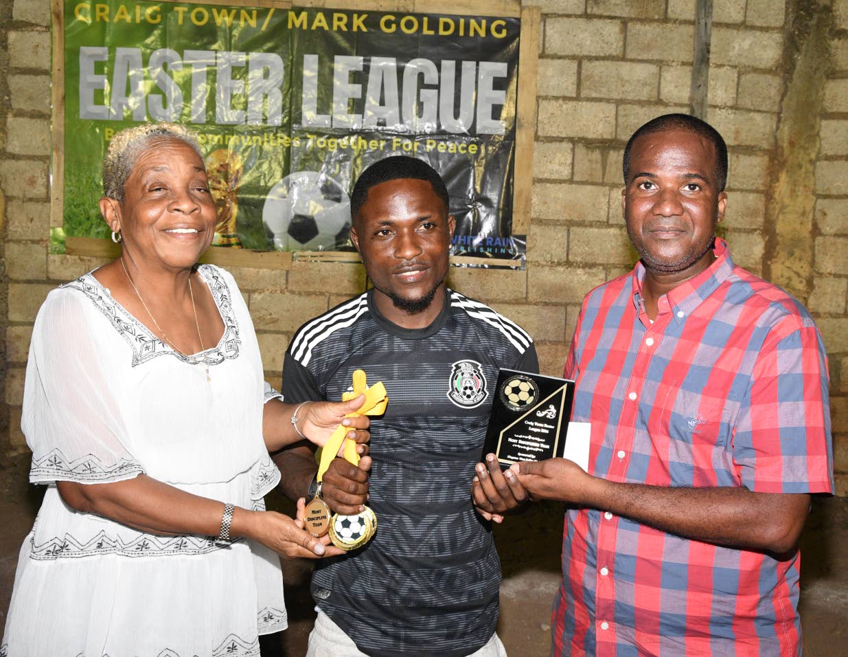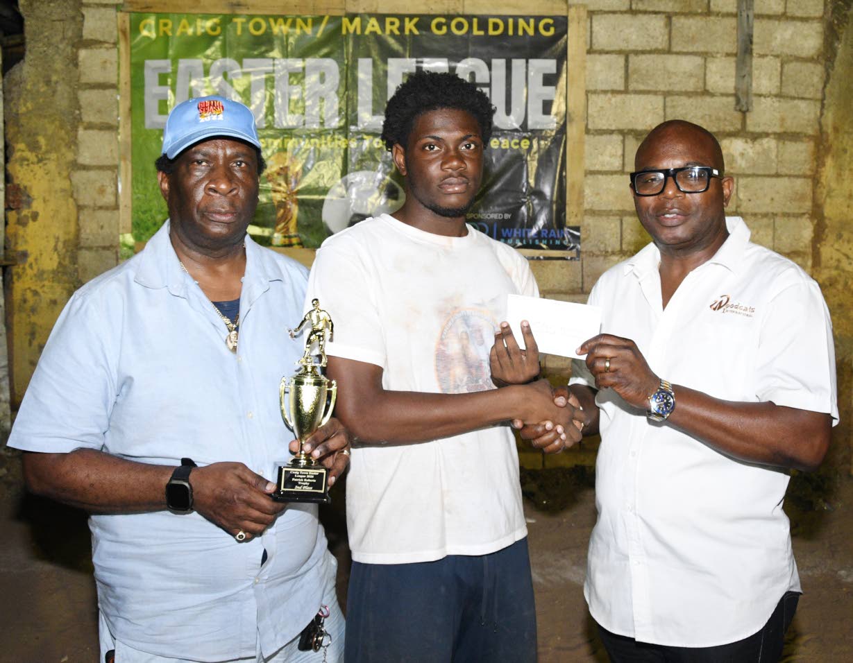 Peter Douglas (right) of Woodcats International makes a presentation to Raequan Stoney (centre) of Gaza, which finished second in the final. Looking on is Councillor Patrick Roberts. (Photo: Joseph Wellington)