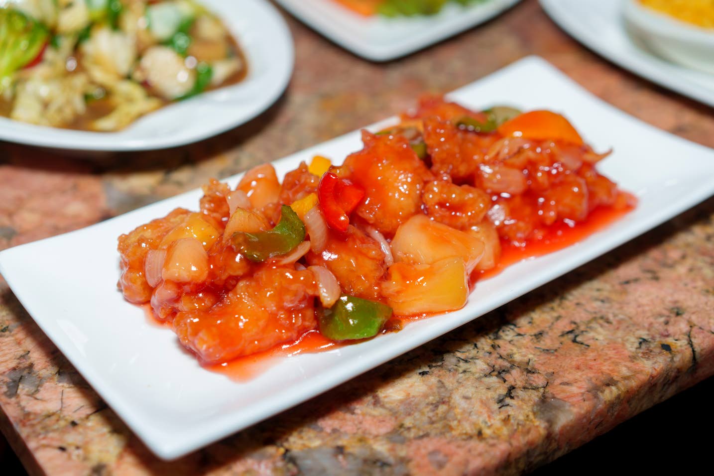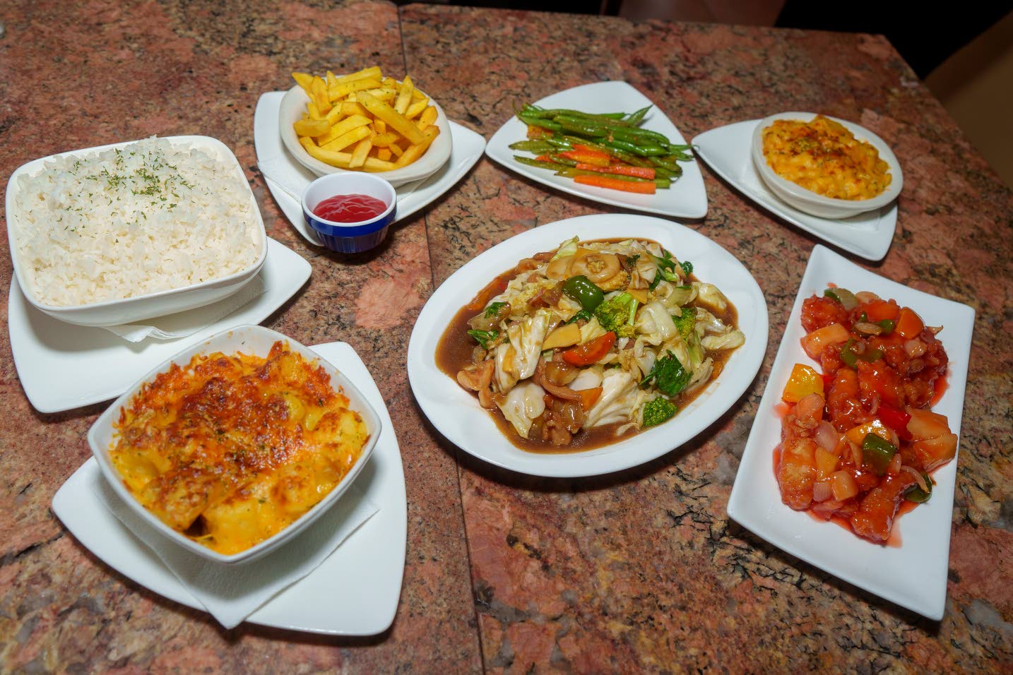 A colourful spread of dishes including barbecue glazed pork belly, baked mac and cheese, sweet and sour fish, and a generous portion of chicken and shrimp chow mein.(Photo: Fernandez Barrett)