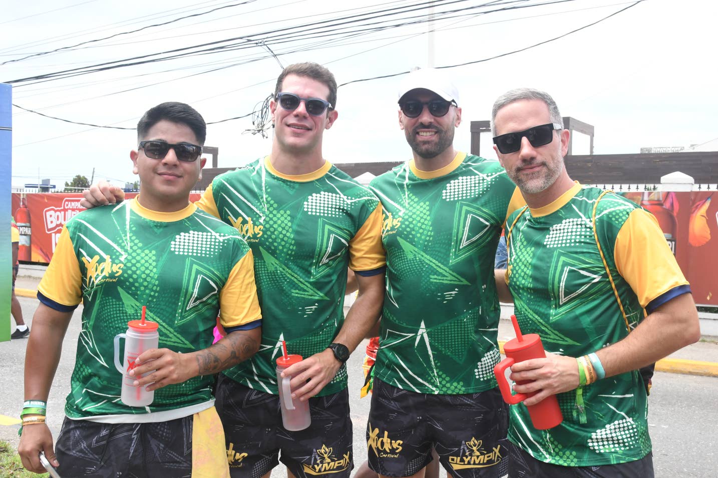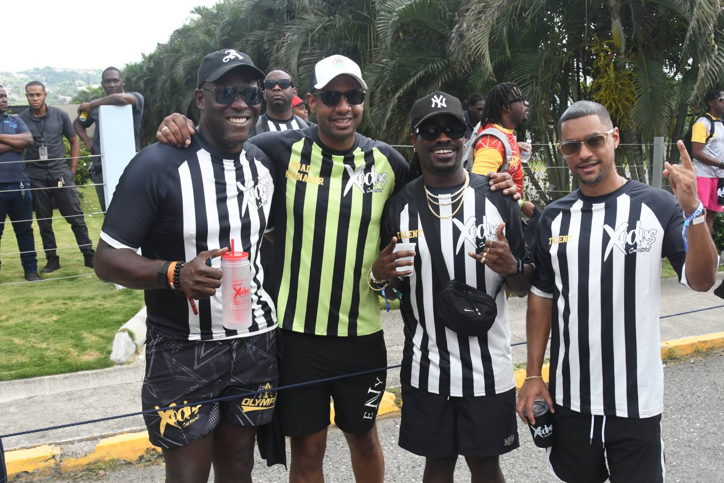 Captured front and centre for Xodus Olympix were (from left) Flow Jamaica Vice-President and General Manager Stephen Price, Carnival in Jamaica Chairman Kamal Bankay, and Trinidadian DJs Kevaughn “Lurbz” Savory and Esan “Dr Esan” Ali. Karl Mclarty