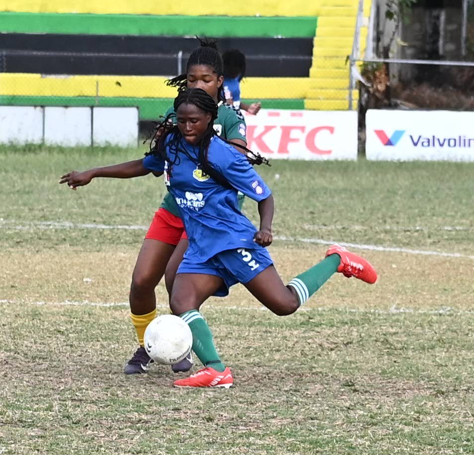 Springers United’s Dilieka Grant (foreground) prepares to shoot the ball under pressure from Real MoBay AFC’s Keronique Bowen during the Jamaica Women’s Premier League match at Jarrett Park on March 17, 2026. Springers won 3-0.