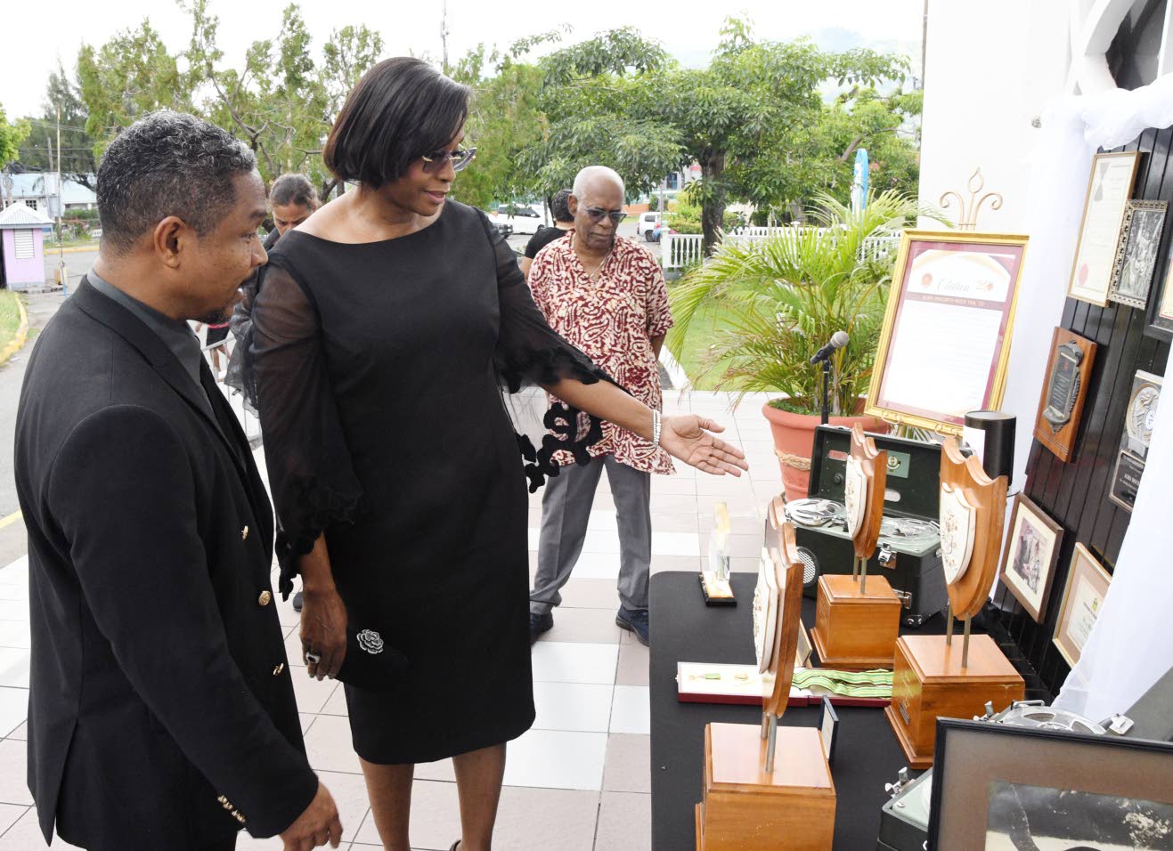 Sean Mockyen, son of the late Alma Mockyen, shows St Andrew East Rural Member of Parliament and Speaker of the House of Representatives Juliet Holness some of the many plaques his mother received, which were on display at the thanksgiving service to celebrate her life on Friday. (Photos: Joseph Wellington)