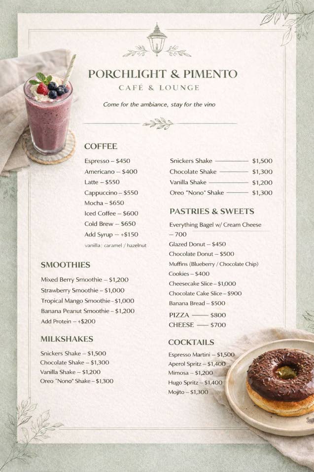 Born and raised in Cromwell Land, St Mary, owner and proprietor Shantal Chin created Porchlight and Pimento as a space to sit, breathe and reset, while enjoying a quiet cup of coffee, glass of wine or a smoothie, sharing in conversation, or simply taking a moment for yourself. It is designed for peace, relaxation, and reflection; a laid-back atmosphere where time softens, worries fade and you are free to get lost if only for a while. So come, take a break, refresh your spirit and feel at home in St Mary.