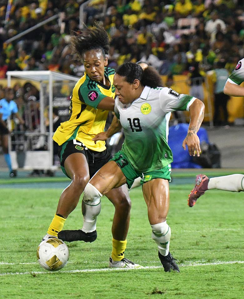 Reggae Girl Atlanta Primus (left) battles for the ball with Guyana’s Jenea Knight during the Concacaf Women’s Qualifier Group B encounter at the National Stadium on Saturday, April 18, 2026. (Photo: Garfield Robinson)