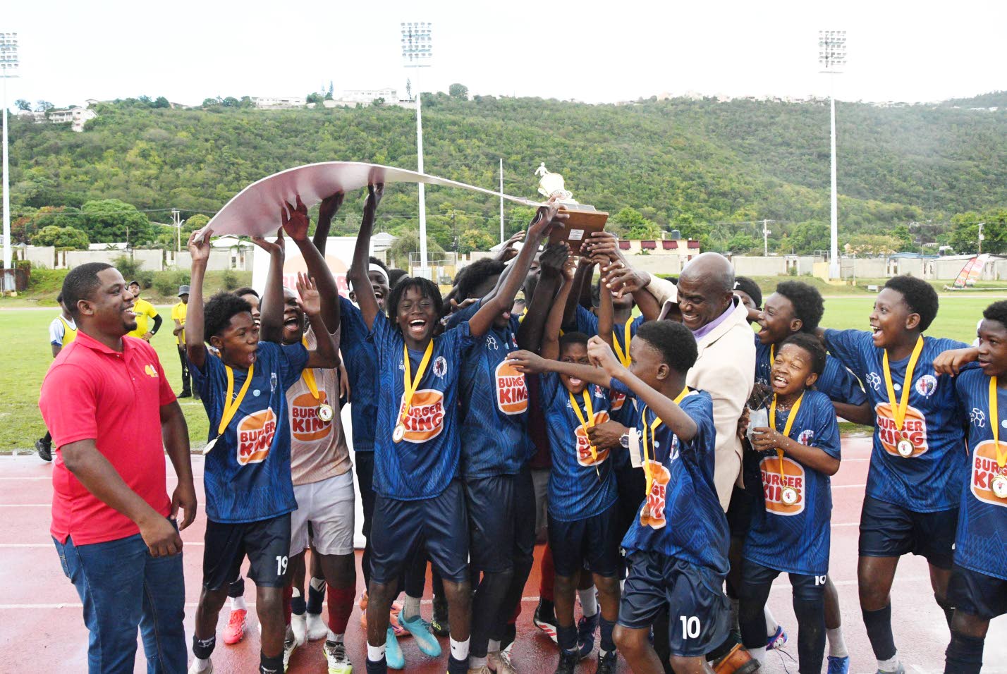 Members of Jamaica College’s under-14 team celebrate with the trophy after defeating Kingston College 4-3 on penalties following a 1-1 scoreline at regulation time, in the final of the ISSA/Burger King Urban Under-14 comeptition at Stadium East on Wednesday, March 11, 2026. (Photo: Joseph Wellington)