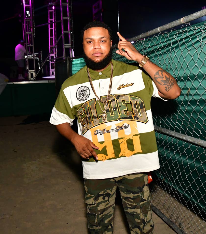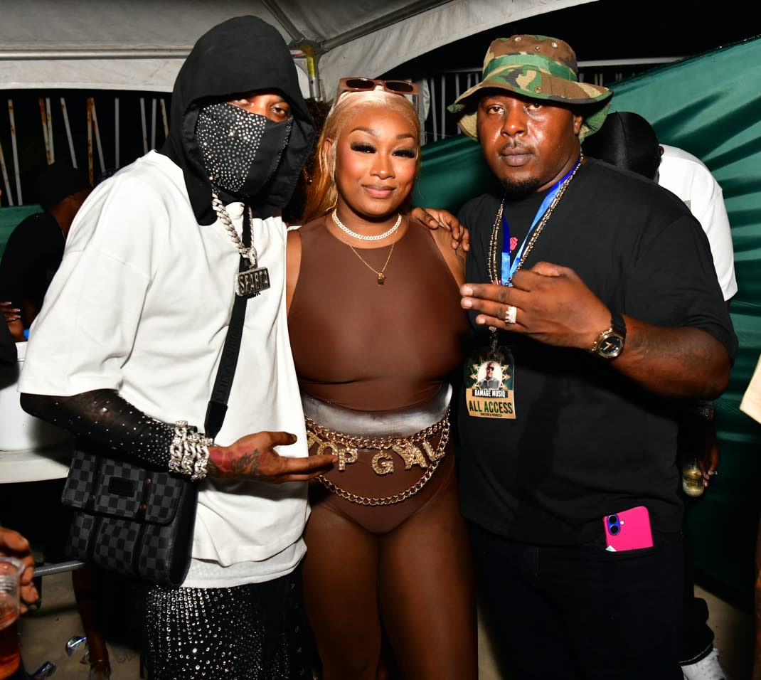 Dancehall artiste Shaneil Muir is flanked by Tommy Lee Sparta (left) and Dwayne Parkinson, CEO, Damage Musiq Group. Aceion Cunningham