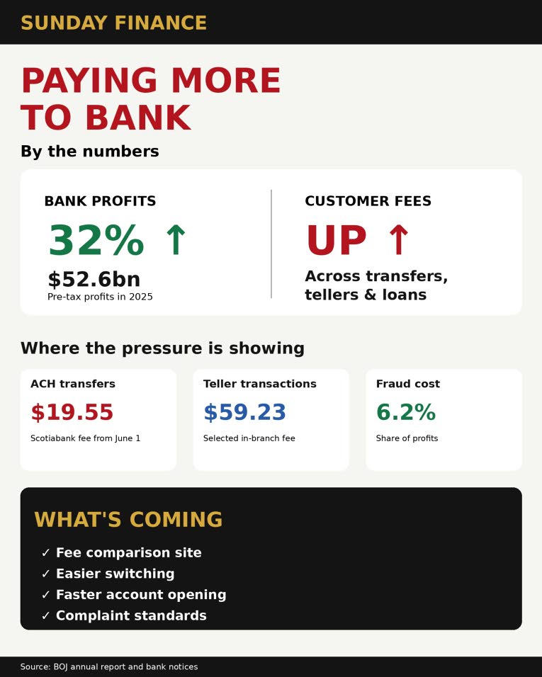 JAMAICANS are being asked to pay more to move, withdraw and manage their own money as commercial banks raise fees across the financial system, even as the sector posts sharply higher profits.