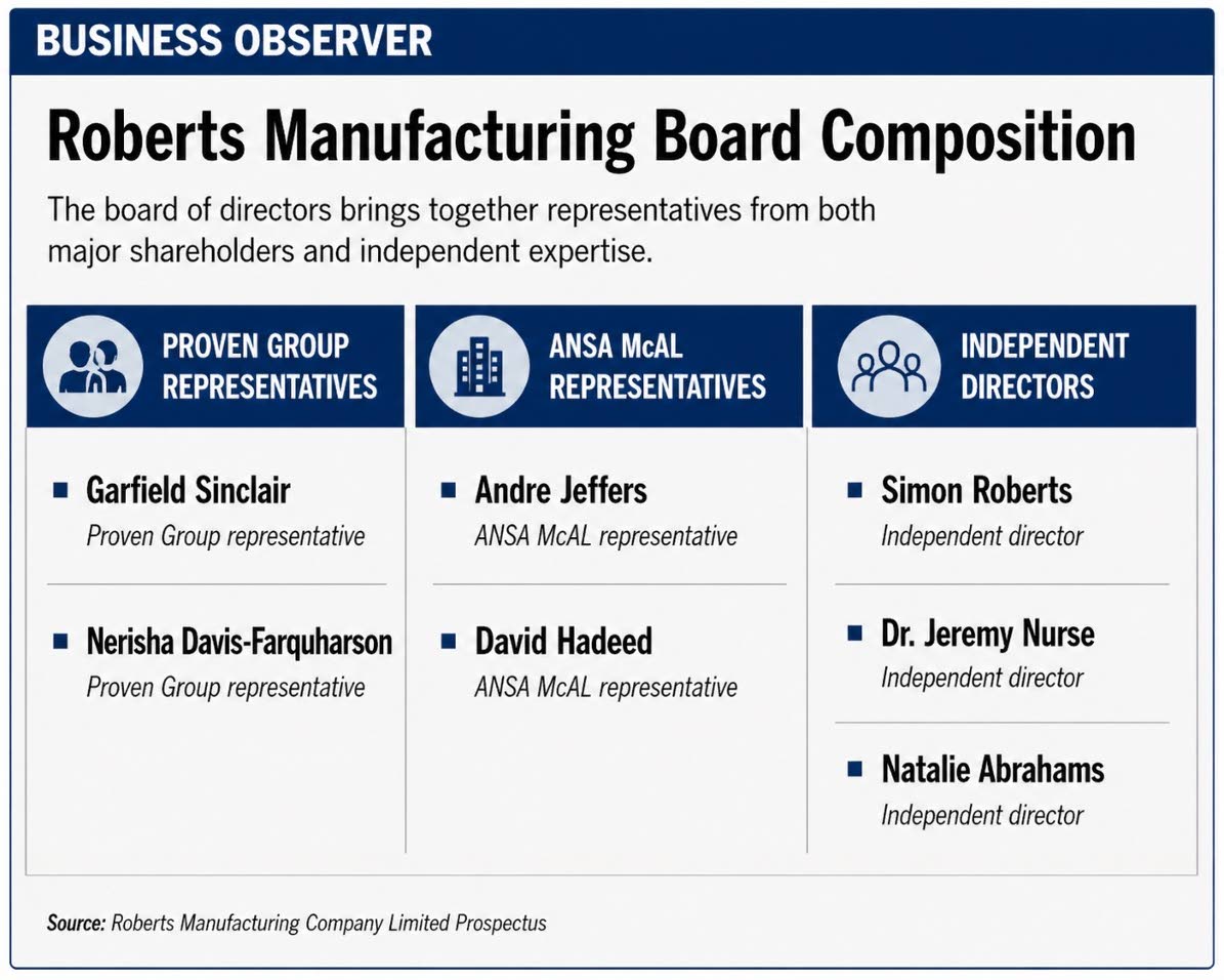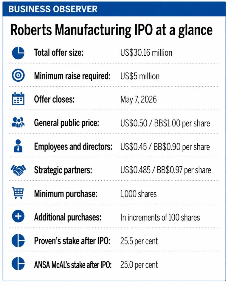 Proven and ANSA McAL currently jointly control Roberts, with Proven owning 50.5 per cent and ANSA McAL holding 49.5 per cent. If the offer is fully subscribed, Proven’s stake would fall to 25.5 per cent, while ANSA McAL’s would be reduced to 25 per cent, while both shareholders retain strategic control of the company which will list on the Barbados Stock Exchange (BSE).