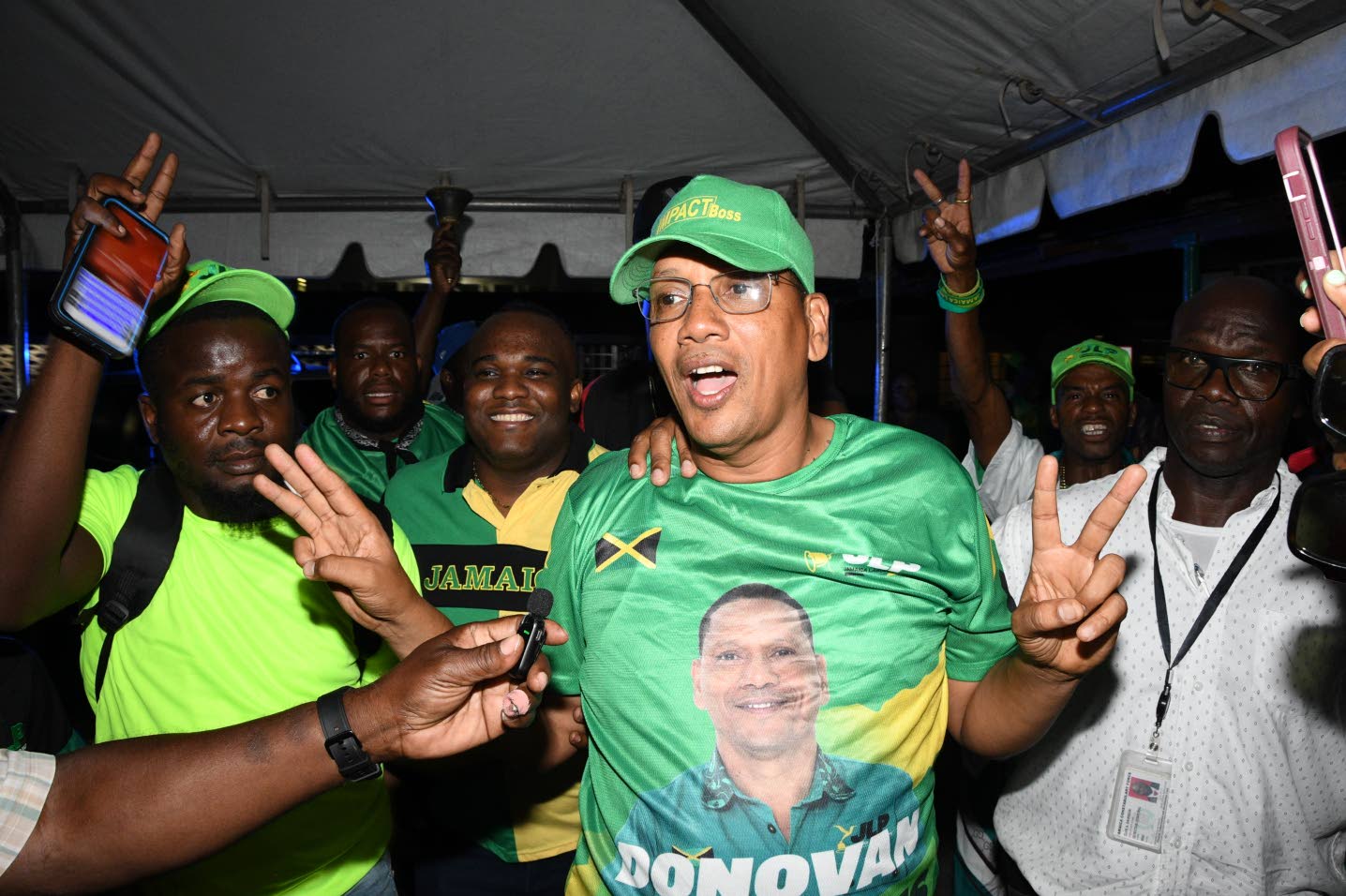 Jamaica Labour Party (JLP) candidate for Kingston Central Donovan Williams celebrates with supporters at Convent of Mercy Academy Alpha on Friday evening after the official count of votes in the September 3, 2025 General Election showed that he had won the seat.