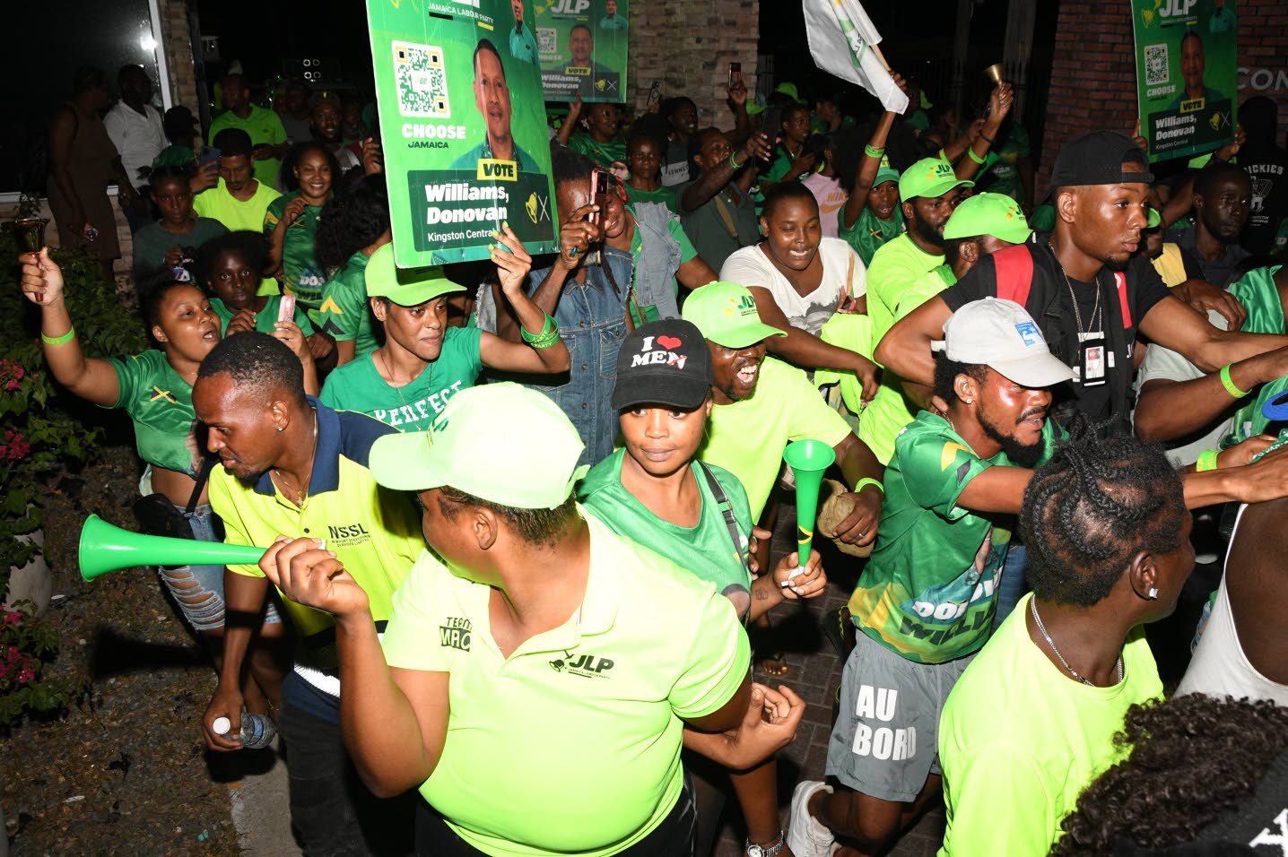 Supporters of Jamaica Labour Party candidate for Kingston Central Delroy Williams celebrate Friday at Convent of Mercy Academy Alpha after the official count of votes in the September 3, 2025 General Election showed that he had won the seat.