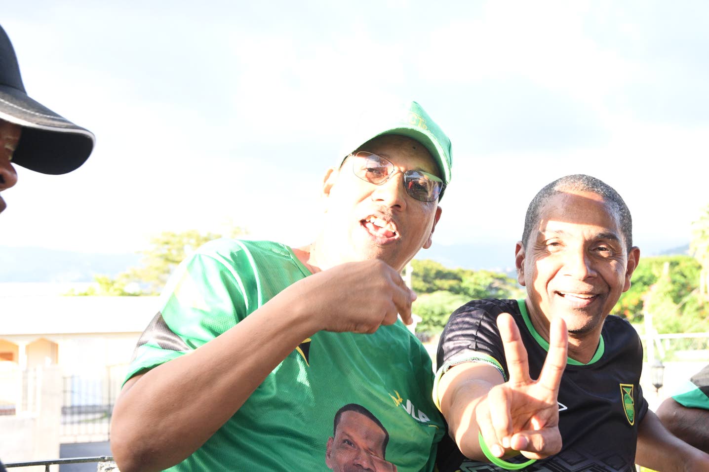 Khari Douglas and Lawrence Rowe, two former members of the People’s National Party now Jamaica Labour Party supporters, celebrate Friday after Kingston Central candidate, Donovan Williams was declared winner of the seat in the September 3, 2025 General Election.