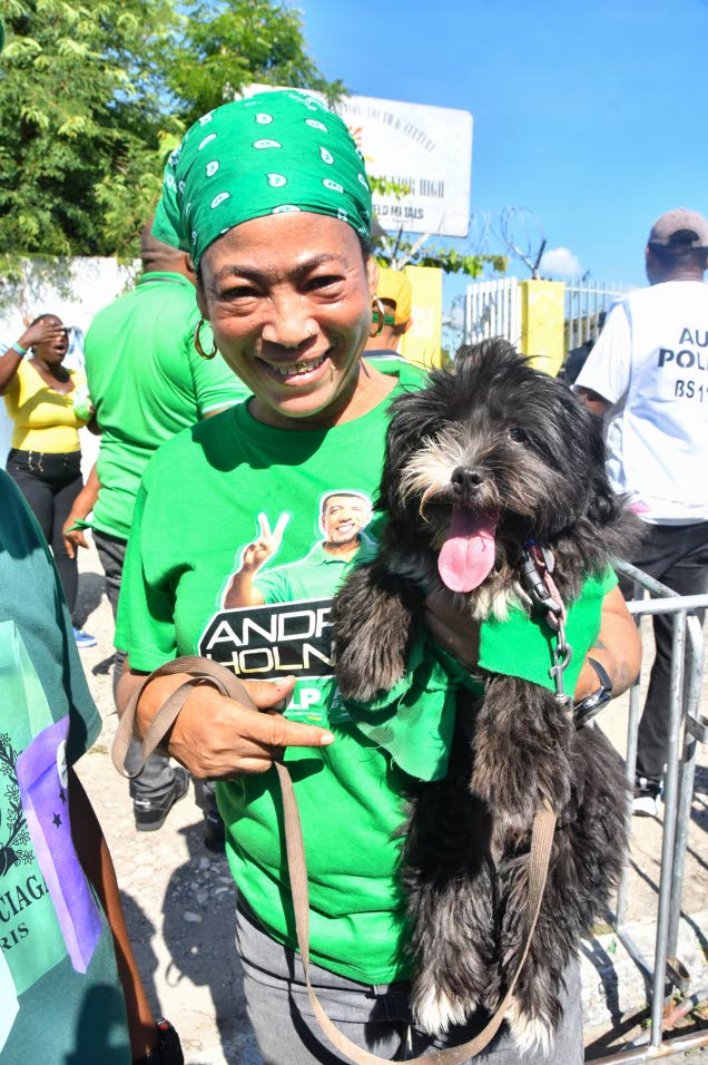 Jamaica Labour Party supporter Sandra Daley holds her dog Crystal outside the polling station at Seaward Primary & Junior High School on election day, September 3, 2025. Photo: Naphtali Junior